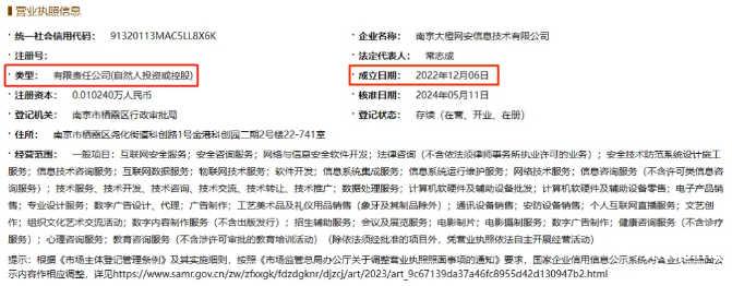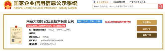 其次,账号所挂靠运营的“南京大橙网安信息技术有限公司”,通过企查查和天眼查进行查证后,它的成立时间在2022年12月06日——既不是政府组织,也不是非营利公益组织,而是一般企业,且与“中国反诈骗联盟”开始投稿的时间“2023年1月1日”相近。