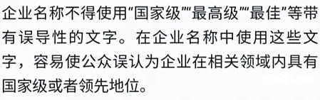 但国家早有规定,企业名称不得使用“国家级”“最高级”“最佳”等带有误导性的文字。